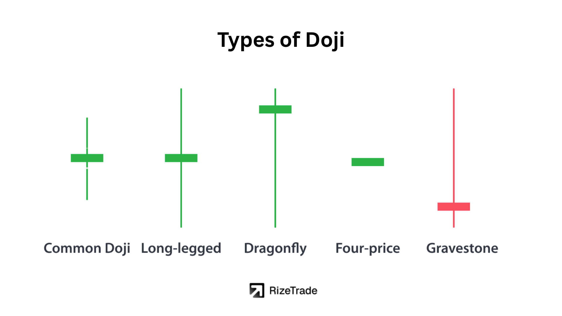 Gravestone Doji: Long upper shadow, no lower shadow — signals potential bearish reversal.