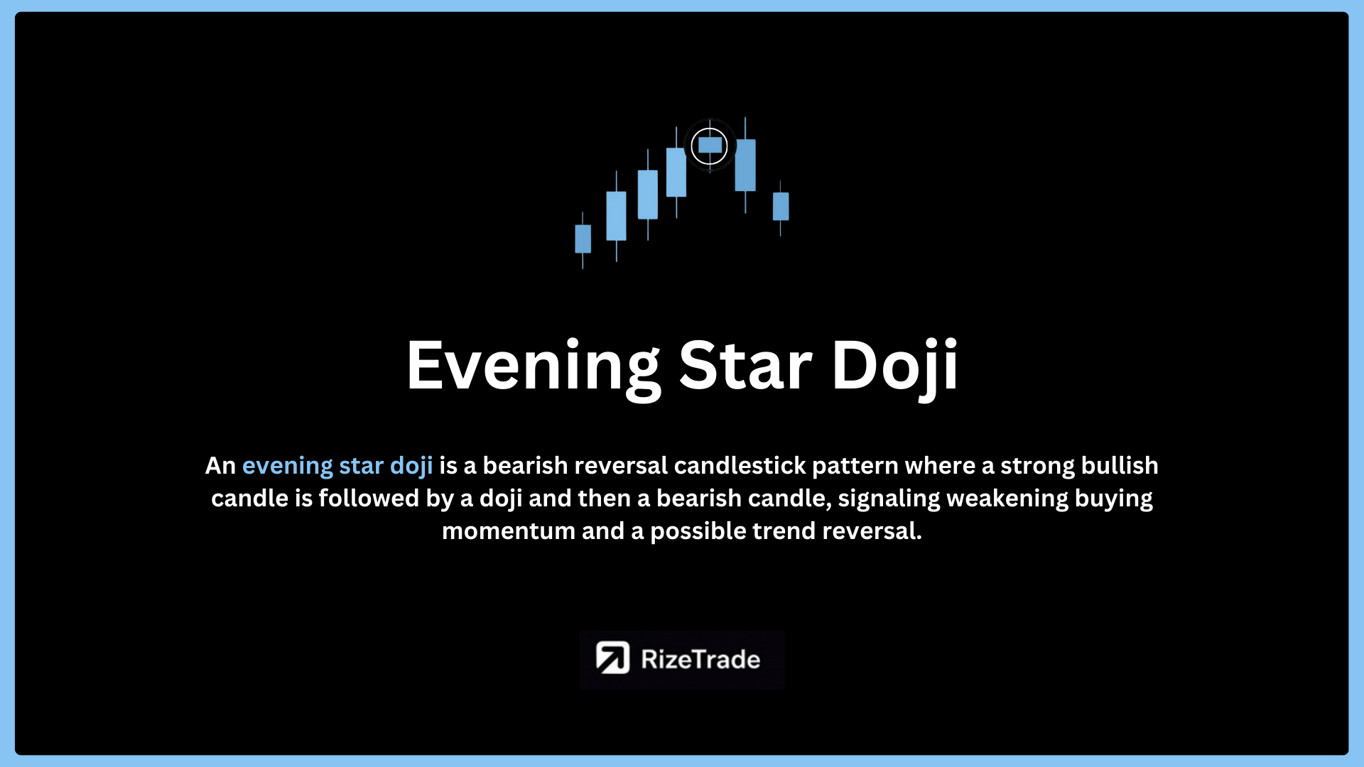 The evening star doji is a three-candle bearish reversal pattern that shows up after a strong uptrend.