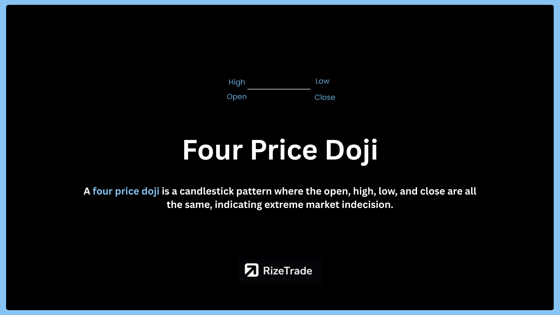 Four Price Doji is a rare neutral pattern that forms when all open, high, low, and close prices are the same, showing complete market indecision.