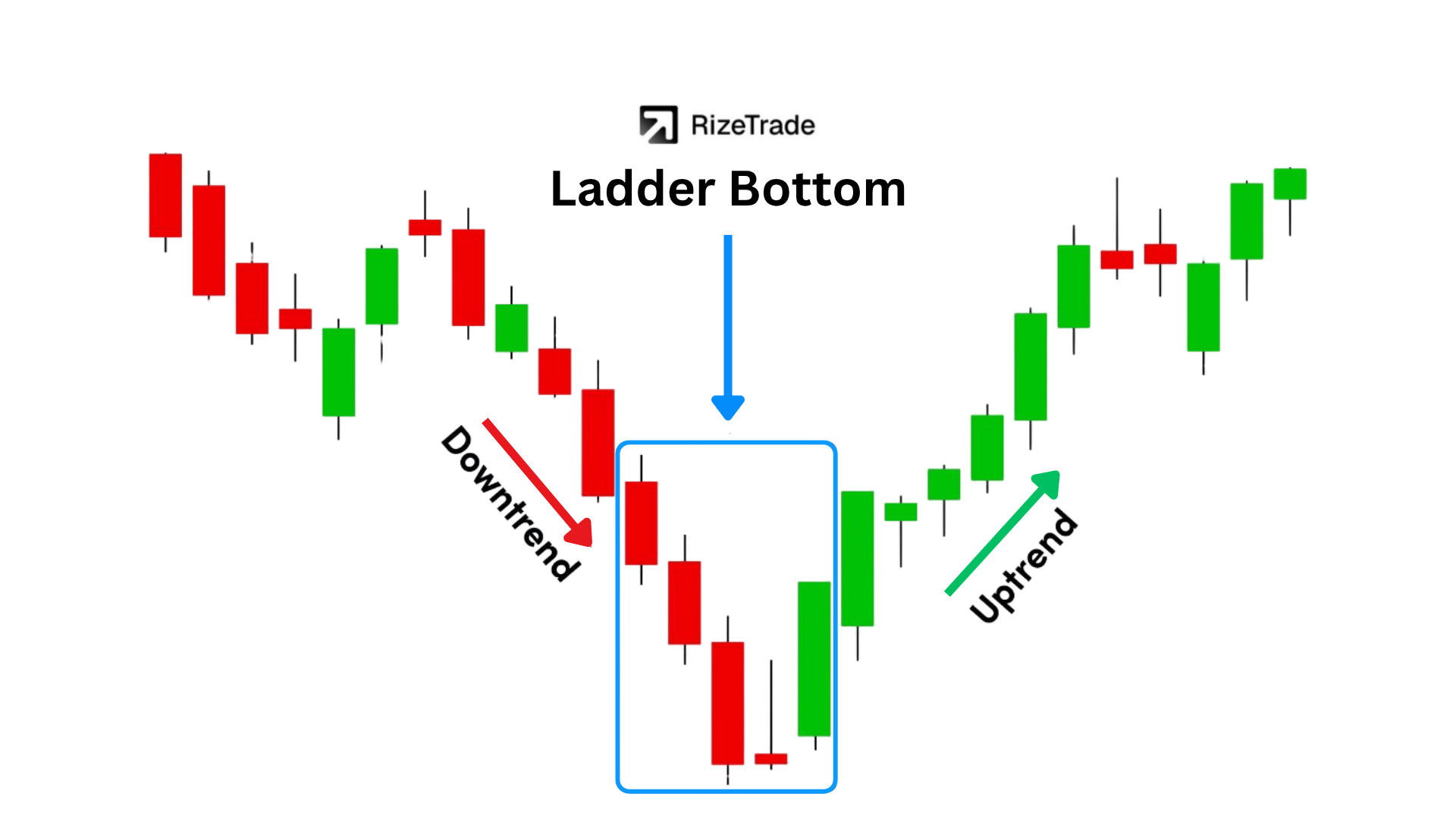 The pattern visually resembles a ladder, with each step lower representing the downtrend before the final bullish candle “climbs” back upward, signaling that buyers are regaining control.