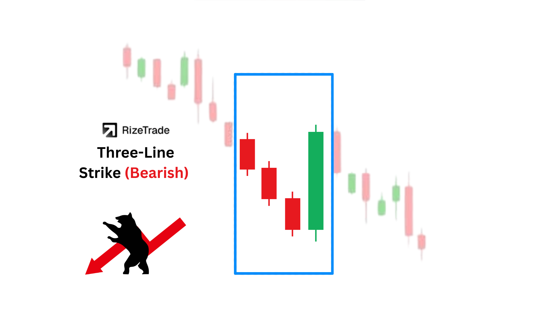 📉 The Bearish Three-Line Strike forms during a downtrend with three bearish candles followed by one strong bullish candle.