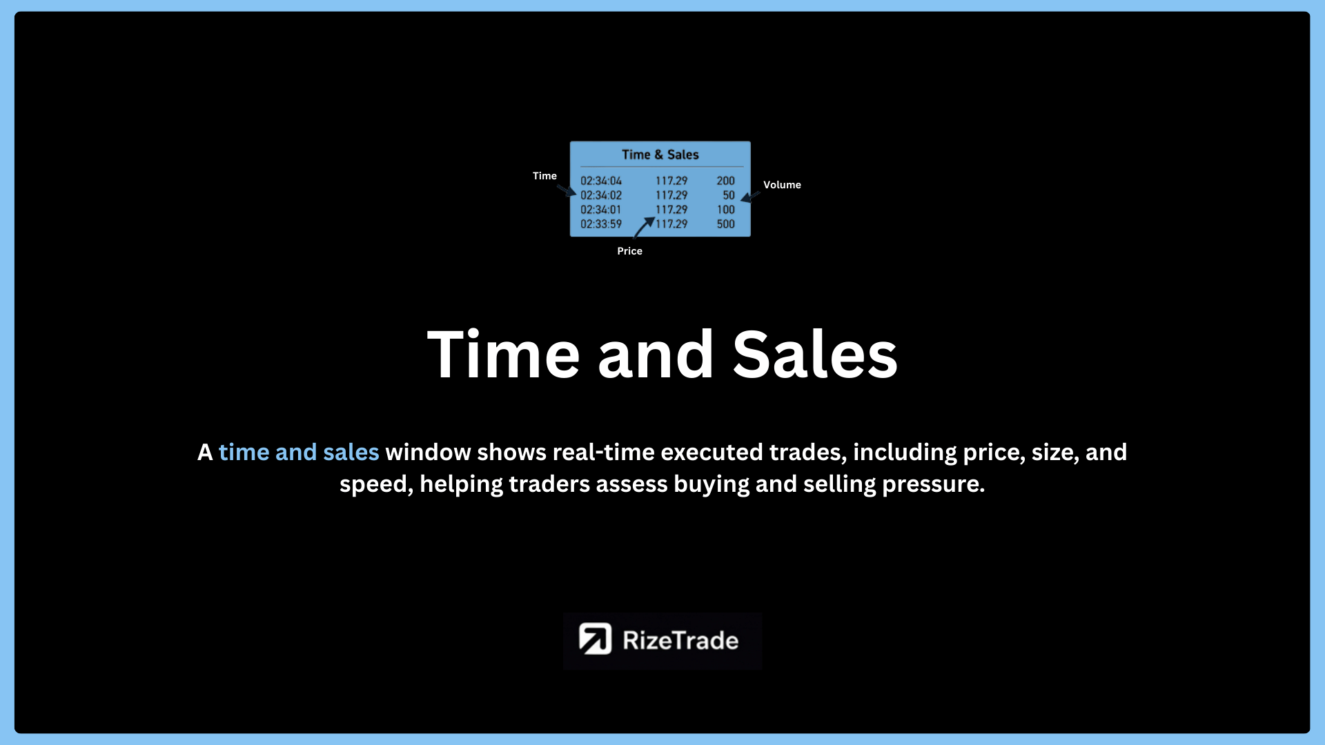Time and sales is the digital version of the old ticker tape. It shows every executed trade with the key details: timestamp, execution price, and size. That raw print stream is what day traders, algo desks, market analysts, and quants lean on when they want to see what actually traded, not just where the quote is sitting.