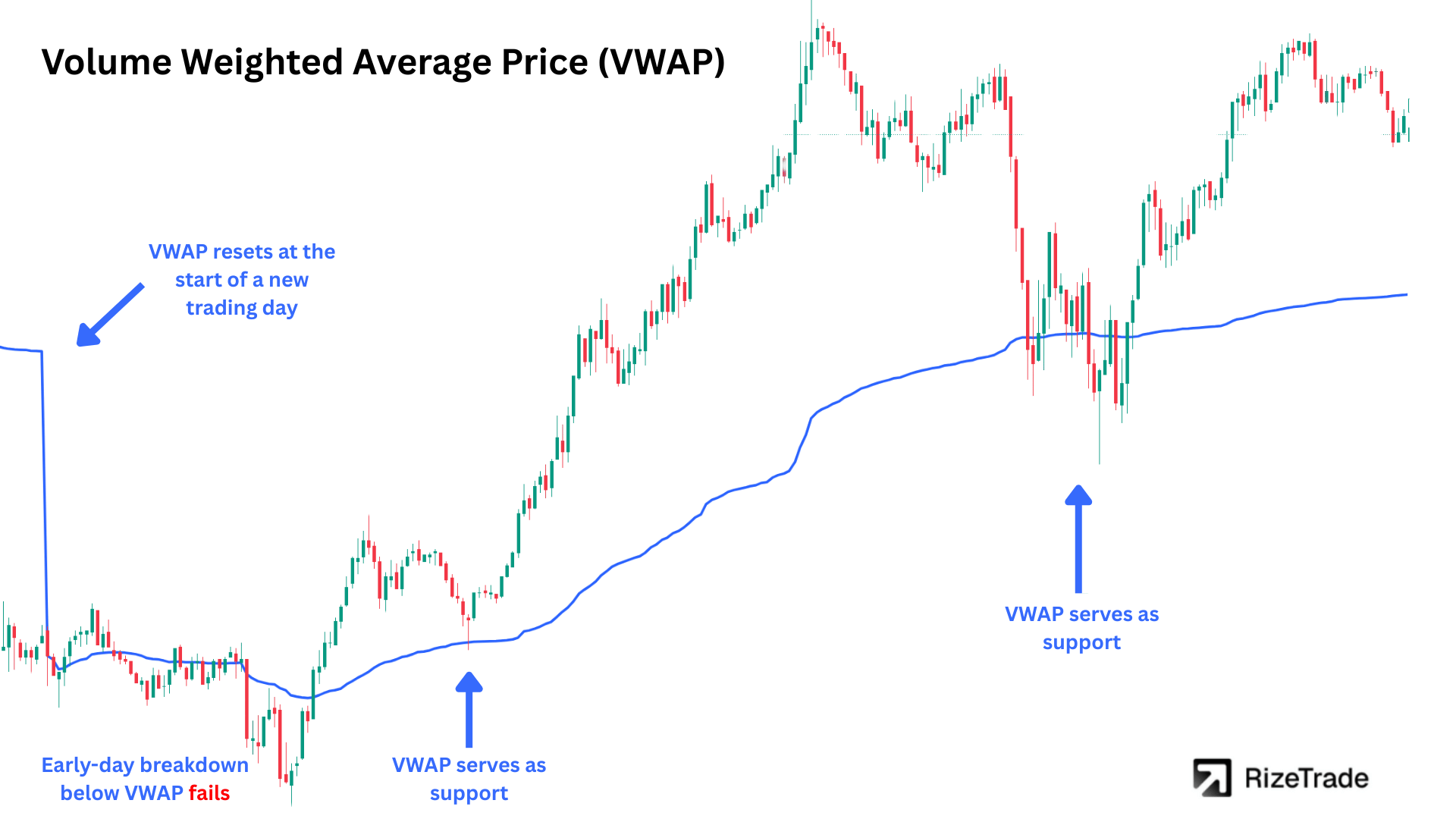 VWAP is the average price weighted by volume, showing where most shares traded throughout the session.