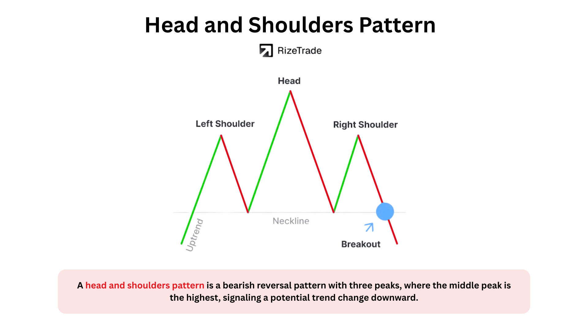 📉 The head and shoulders pattern signals a bearish reversal marking the end of an uptrend.