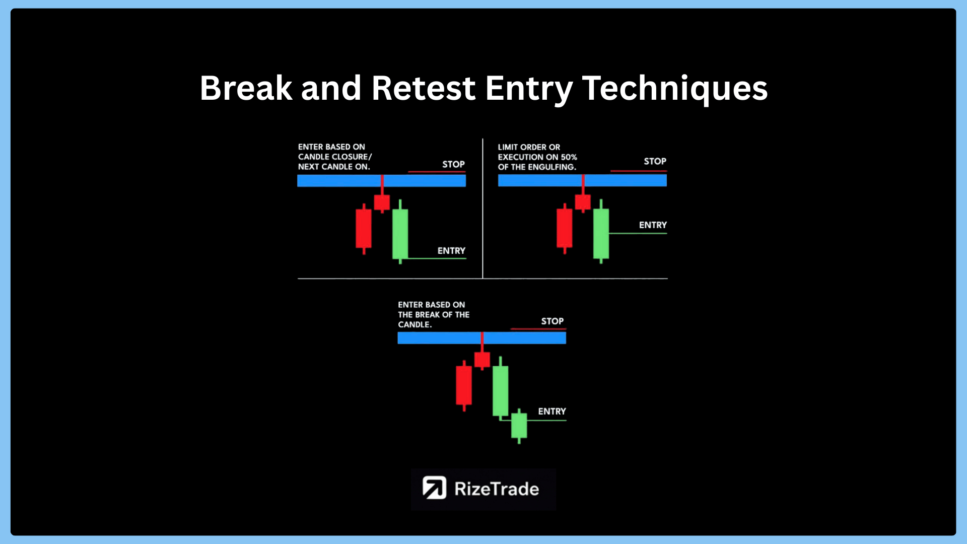 For a bullish break-and-retest, the common placement is just below the retest low or under the rejection candle low.